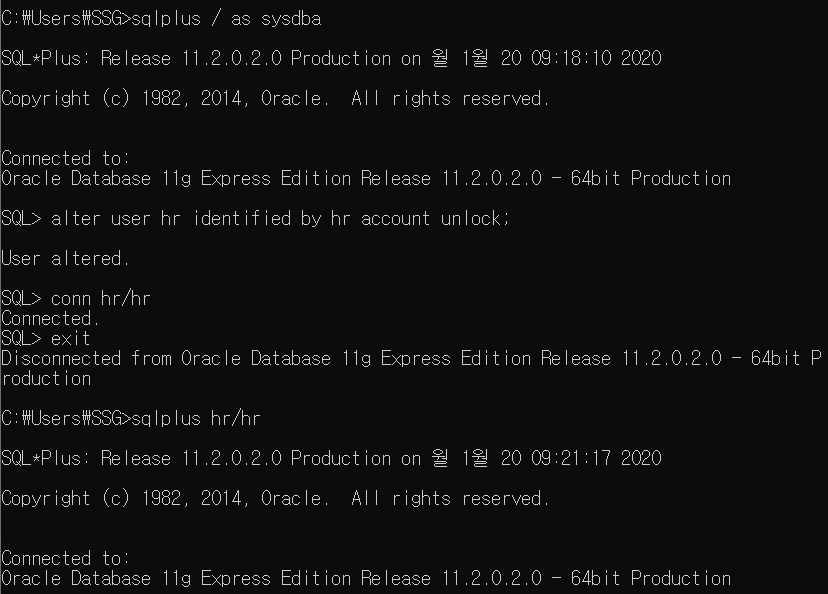 //일반사용자 hr(hr)을 생성하고, unlock하겠다.