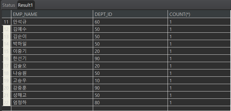 SELECT EMP_NAME, DEPT_ID, COUNT(*)