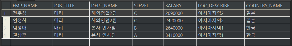 //5개 테이블 조인 후, 직급이 대리, 지역이 아시아인 사원 출력