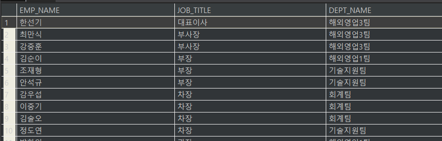 SELECT E.EMP_NAME, J.JOB_TITLE, D.DEPT_NAME