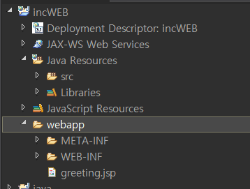 - webapp: web의 루트파일들이 들어간다. jsp나 이미지 등이 들어간다.