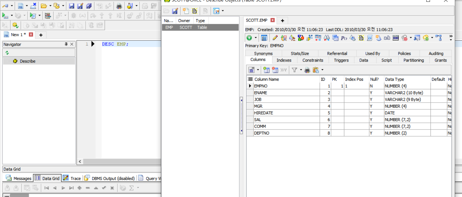 3. SCOTT 계정에 접속한 후 간단한 명령어 실행