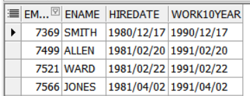 , ADD_MONTHS(HIREDATE, 120) AS WORK10YEAR