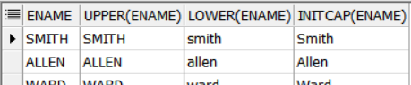 SELECT ENAME, UPPER(ENAME), LOWER(ENAME), INITCAP(ENAME)