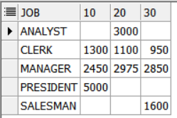 PIVOT(MAX(SAL) FOR JOB IN ('CLEAK', 'SALESMAN', 'PRESIDENT', 'MANAGER', 'ANALYST'))