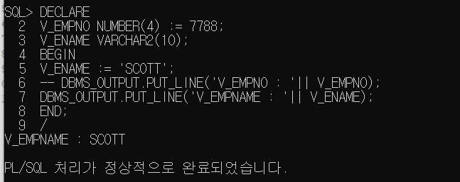- 변수 선언 - ex. V_EMPNO NUMBER(4) := 7788;