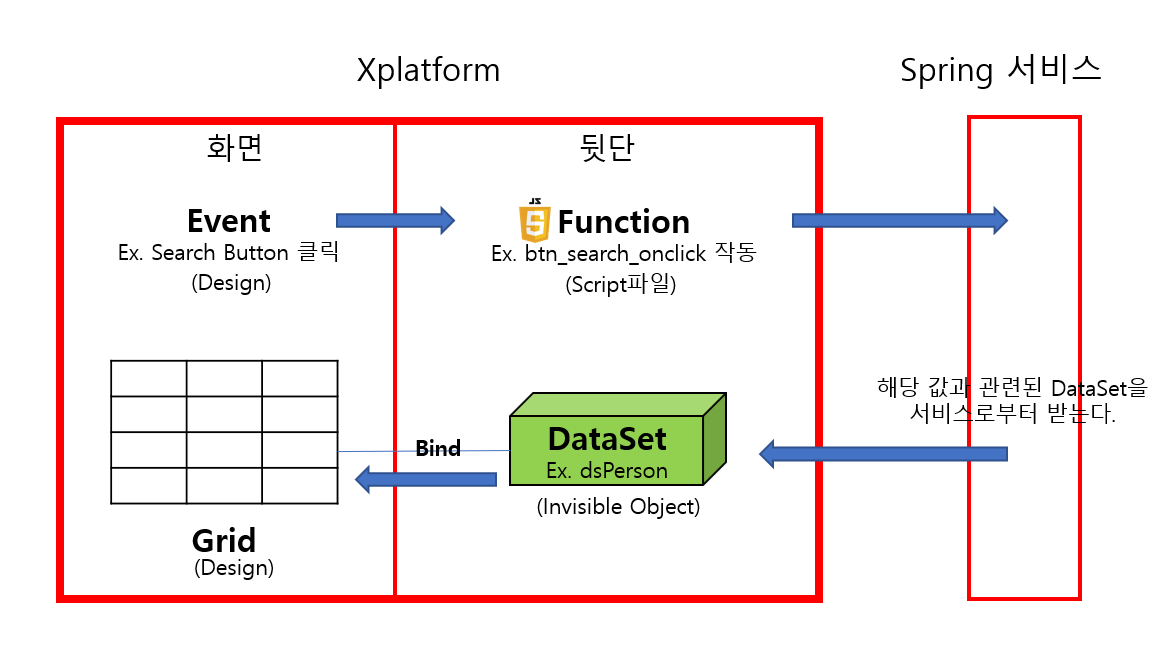 Javascript와 DataSet이라는 개념을 이용해 프론트를 구성하고 Spring과 같은 백엔드와 통신한다.