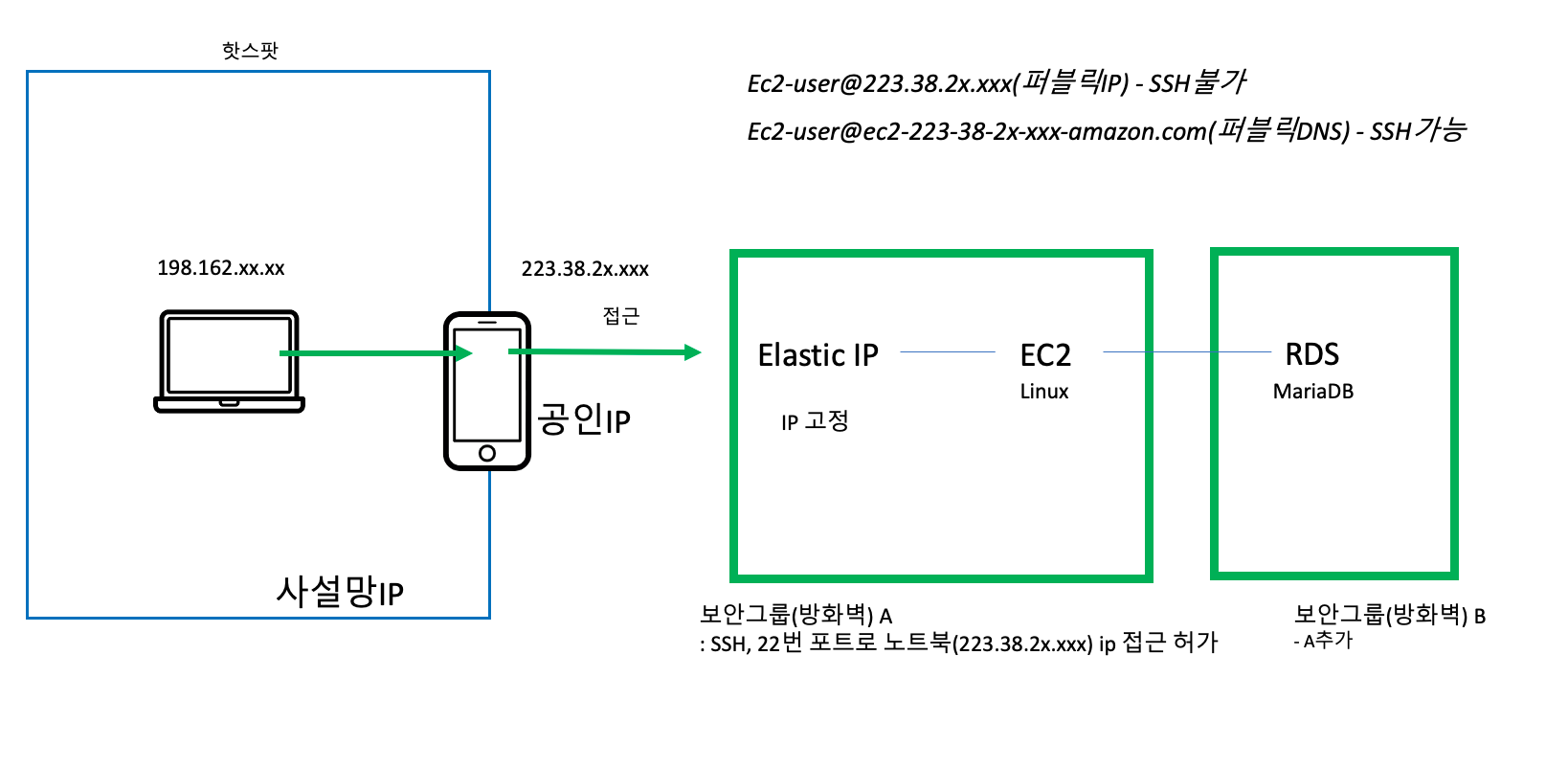 그래도 핫스팟 연결시, 퍼블릭ip와 퍼블릭dns에 따라 ec2에서 받아들이는 ip가 왜 다른지는 모르겠다. ㅠㅠ