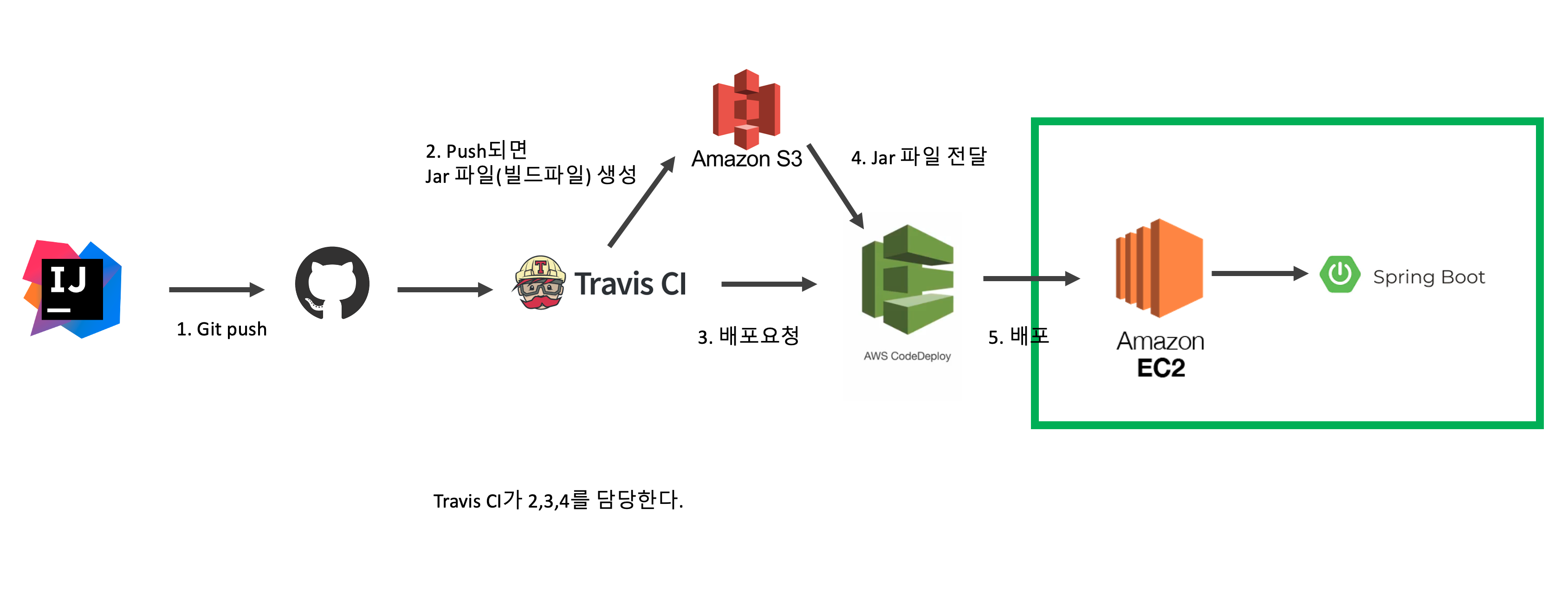 * 빌드(2, 3, 4)는 Travis CI가, 배포(5)는 AWS CodeDeploy가 한다.