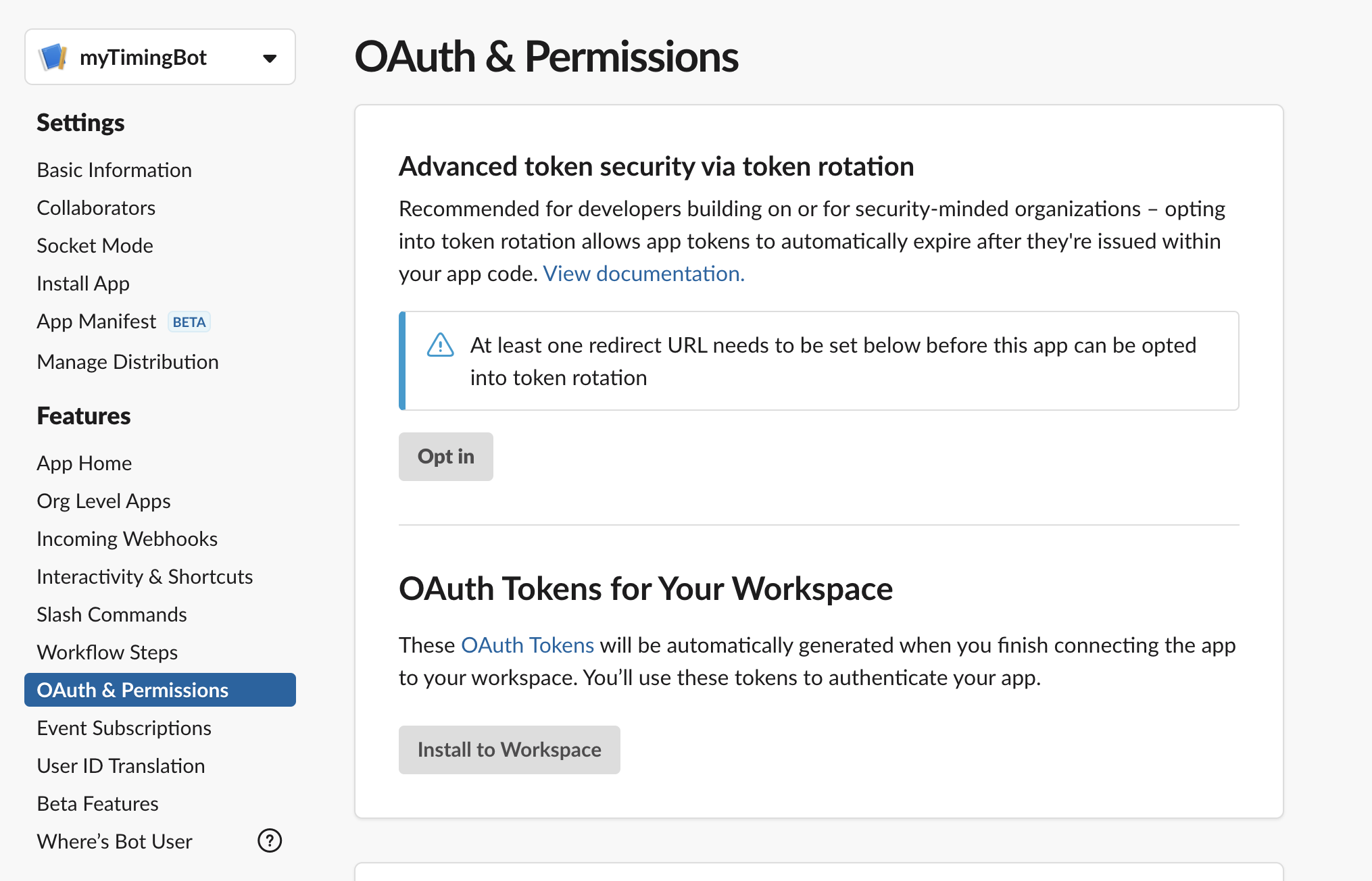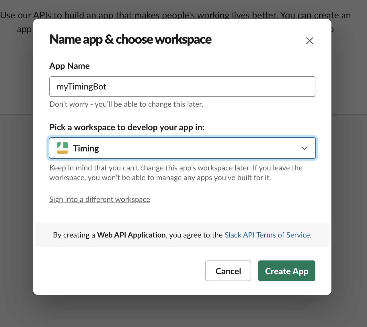 이후 앱 이름과 앱이 설치될 워크스페이스를 지정한다. (앱명: myTimingBot, 설치워크스페이스: Timing)