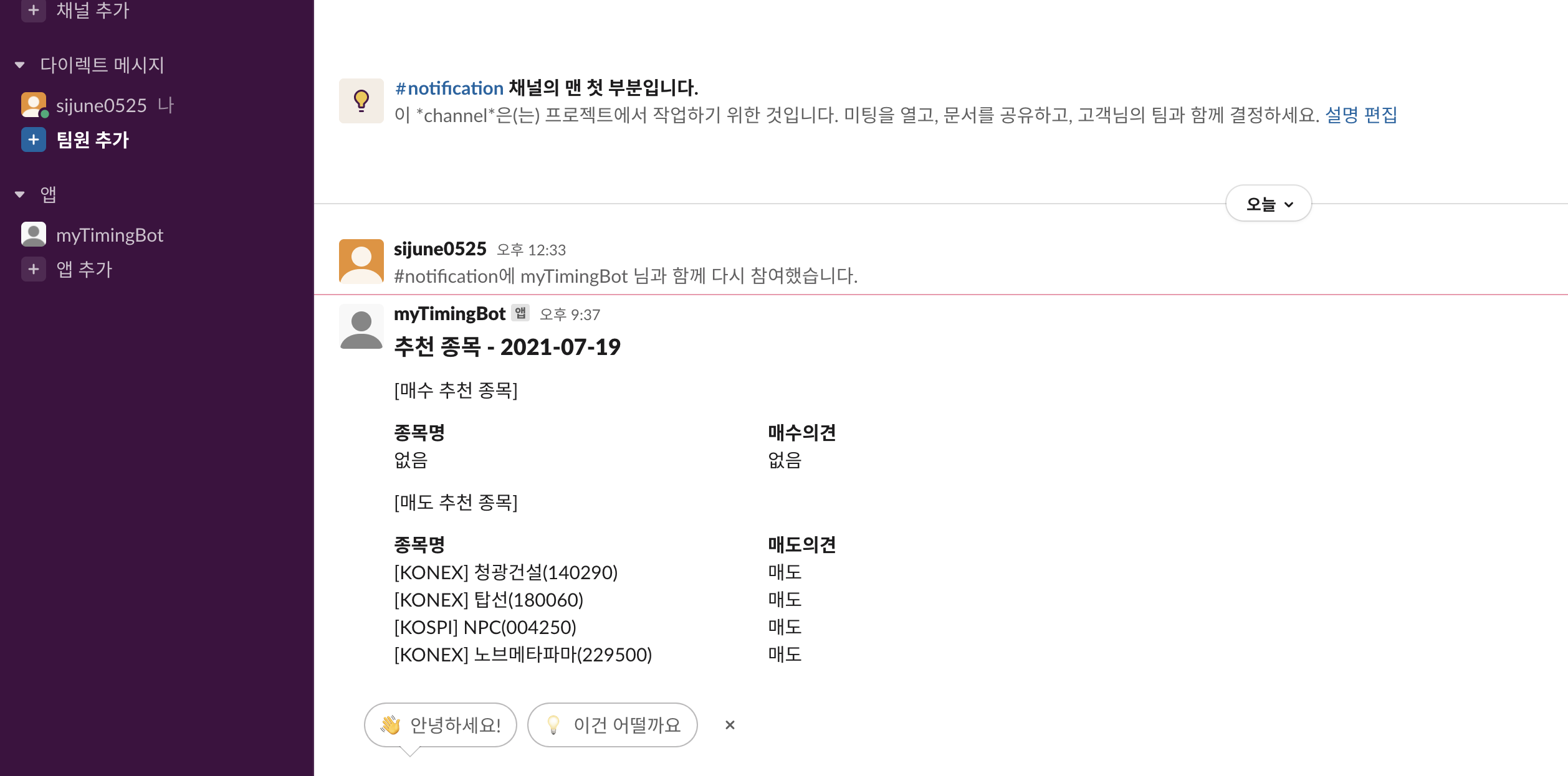 "text": "추천 종목 - " + notify_sell_summary['analysis_date'].values[0]
