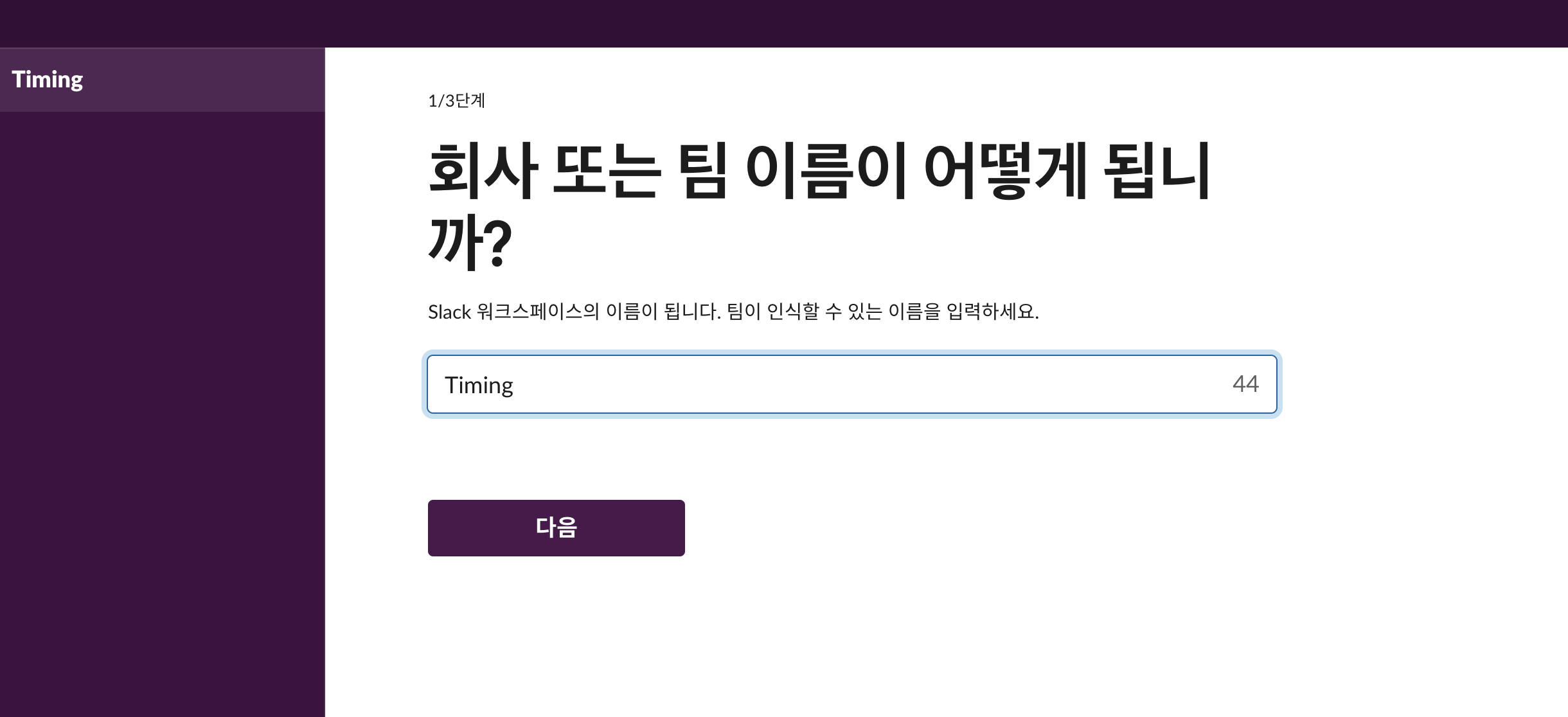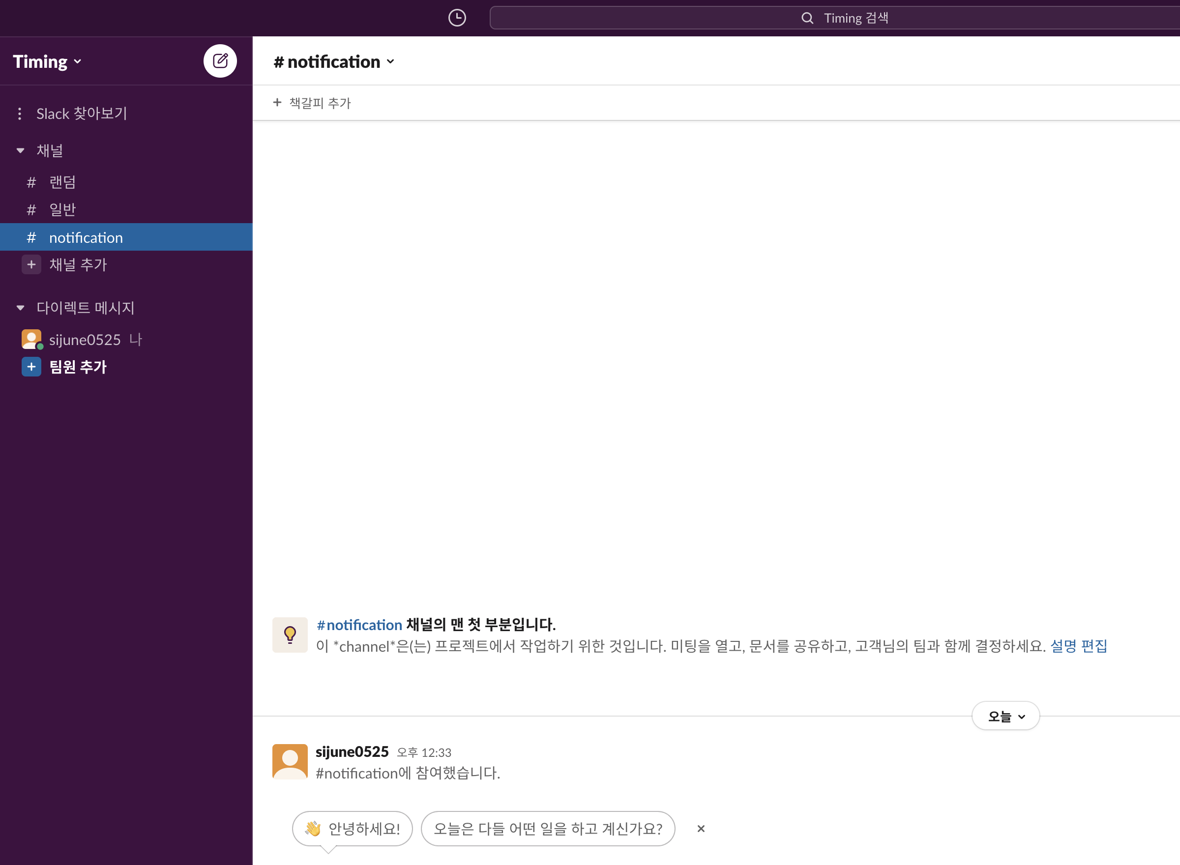 우선 알림을 받을 워크 스페이스를 먼저 생성한다. 워크스페이스 생성 시 채널이름을 입력하는 부분도 있으니 나중에 만들기 귀찮으면 워크스페이스 생성 시 만들면 된다. (워크스페이스명: Timing, 채널명: notification)