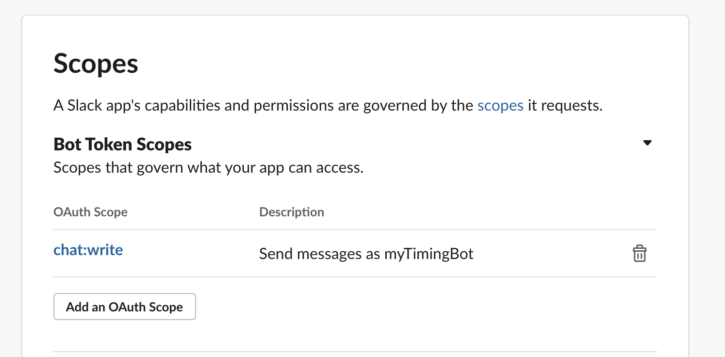 선택 후 나오는 화면 왼쪽 탬에서 oAuth & Permission을 선택한다. 해당 탭에서는 봇의 권한을 부여하는데, 단순한 알림을 구현할 것이므로 'chat:write'를 선택하고 'Install to Workspace'를 클릭한다.