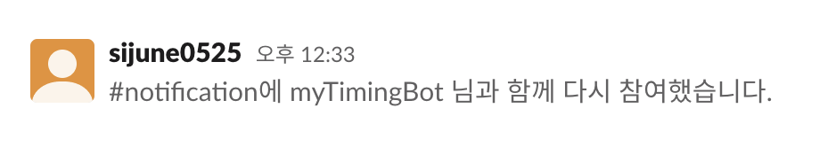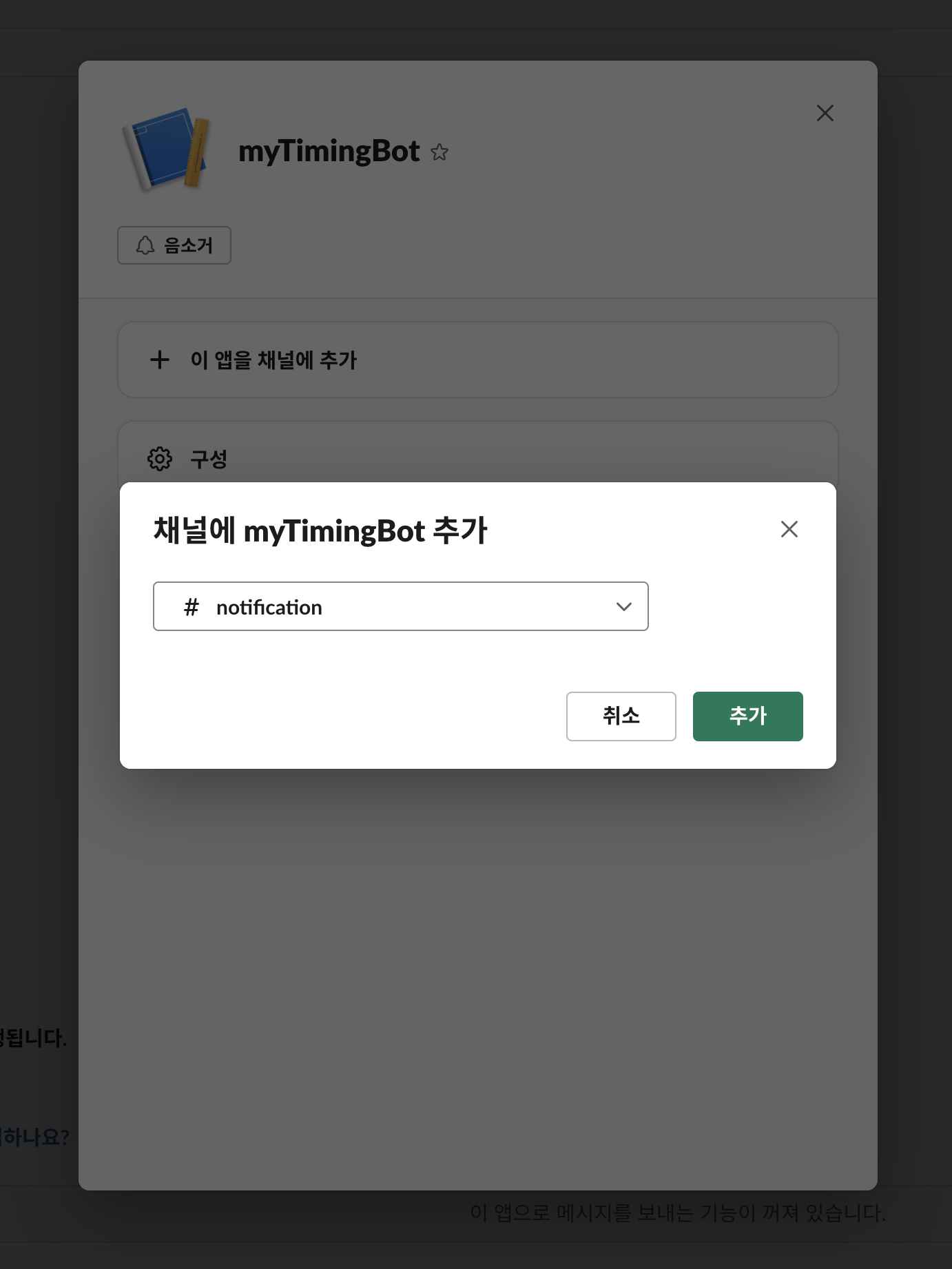 워크스페이스 내 myTimingBot을 선택하여 알림을 받을 채널(notification)에 생성된 봇앱을 추가한다.