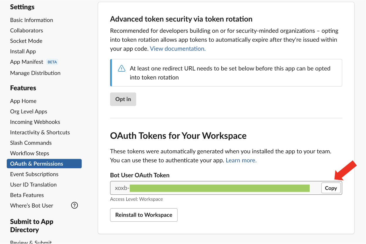 'Install to Workspace'를 클릭하면 봇앱이 생성되며, 토큰을 파이썬 배치에서 사용해야 하므로 복사해서 저장해둔다.