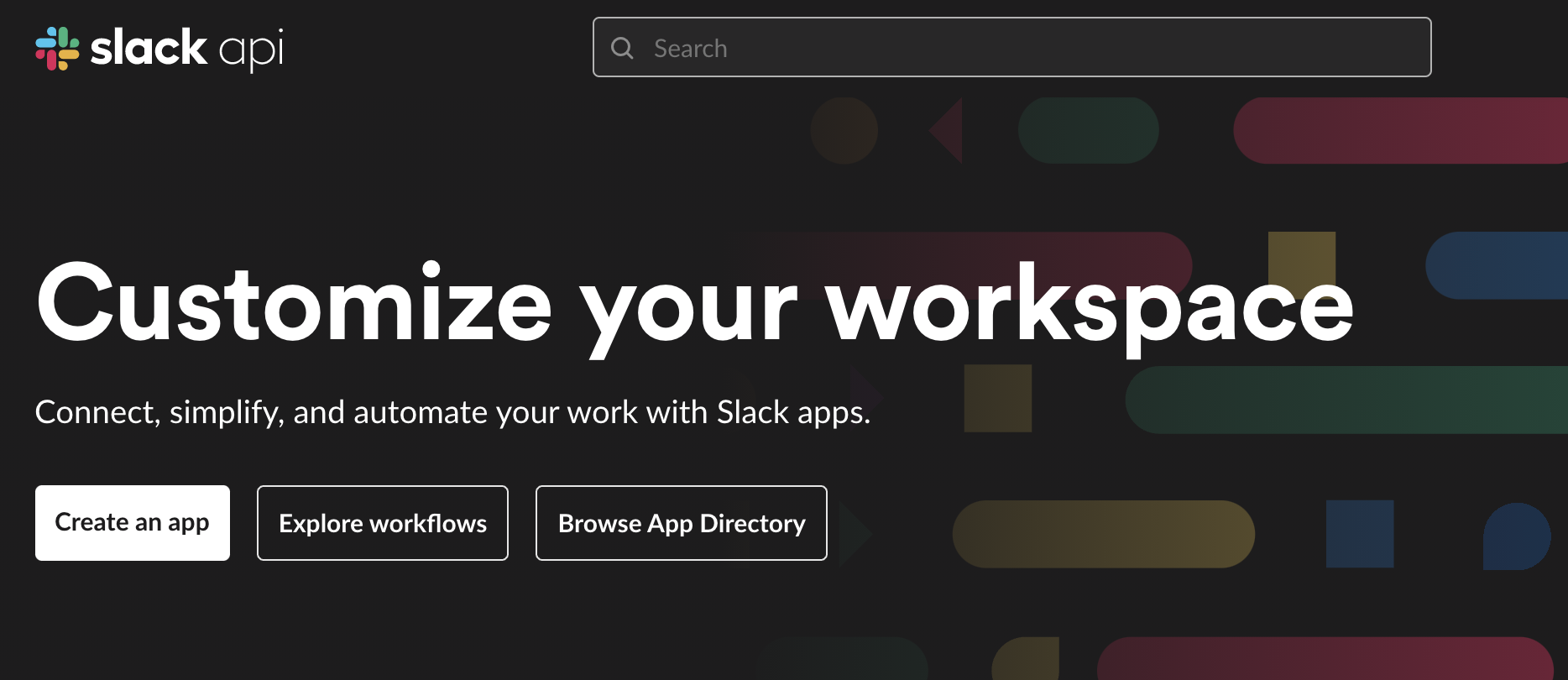 slack api에 접속하여 사용할 bot app을 생성한다. slack api 홈페이지에 들어가면 메인화면에 'create an app' 버튼이 있는데 클릭해준다.