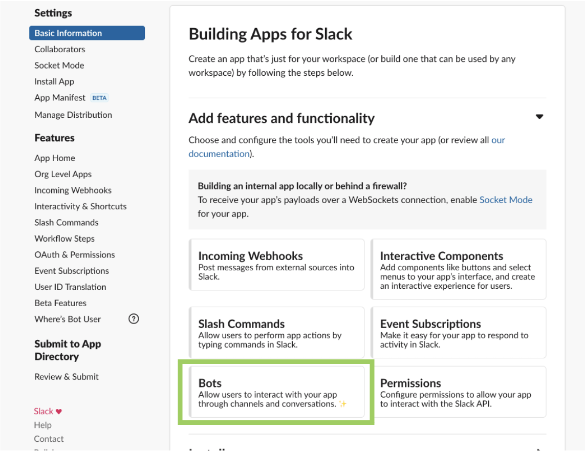 이후 App 형태를 지정한다. 단순히 알림봇을 구현할 예정이므로 Bots를 선택한다,
