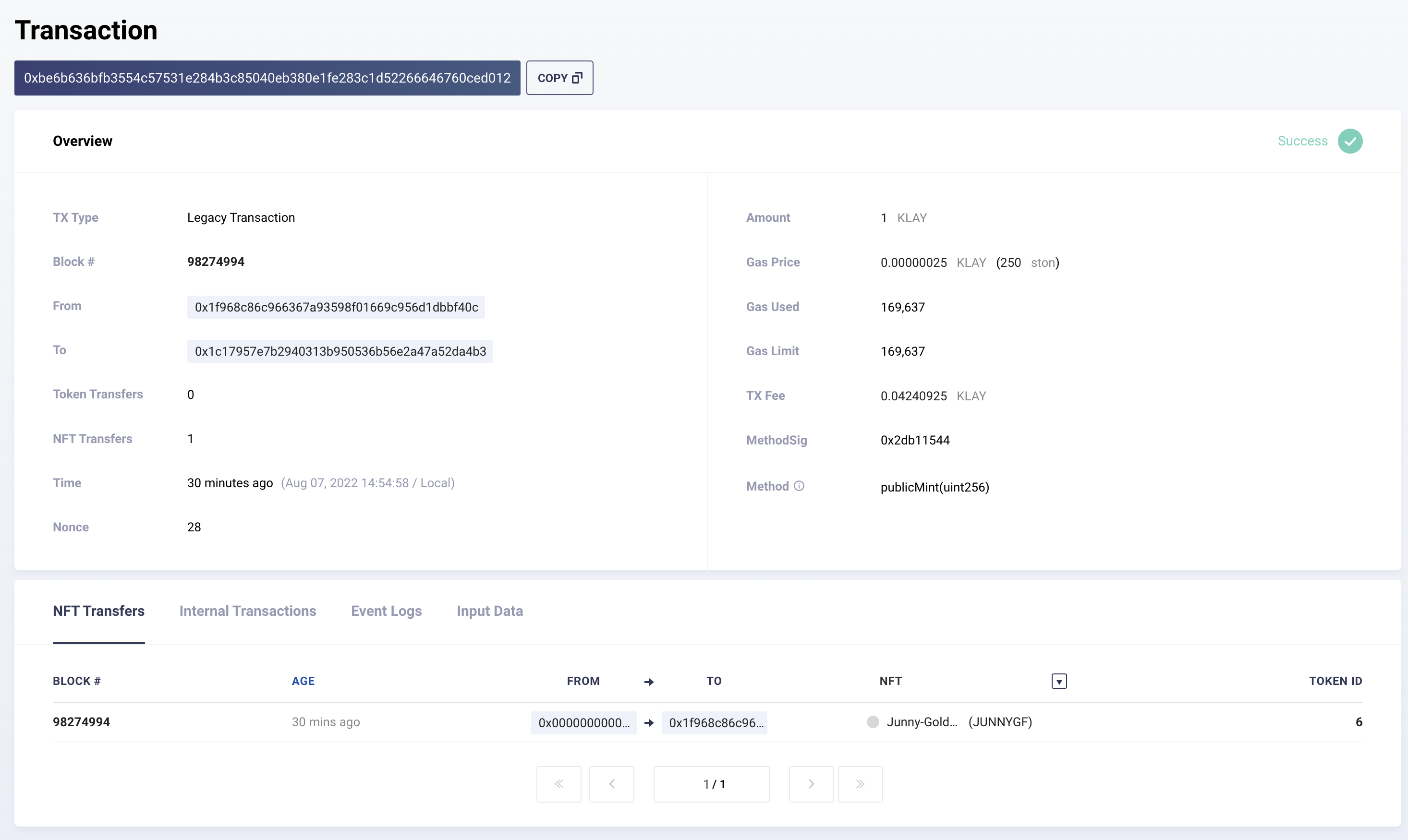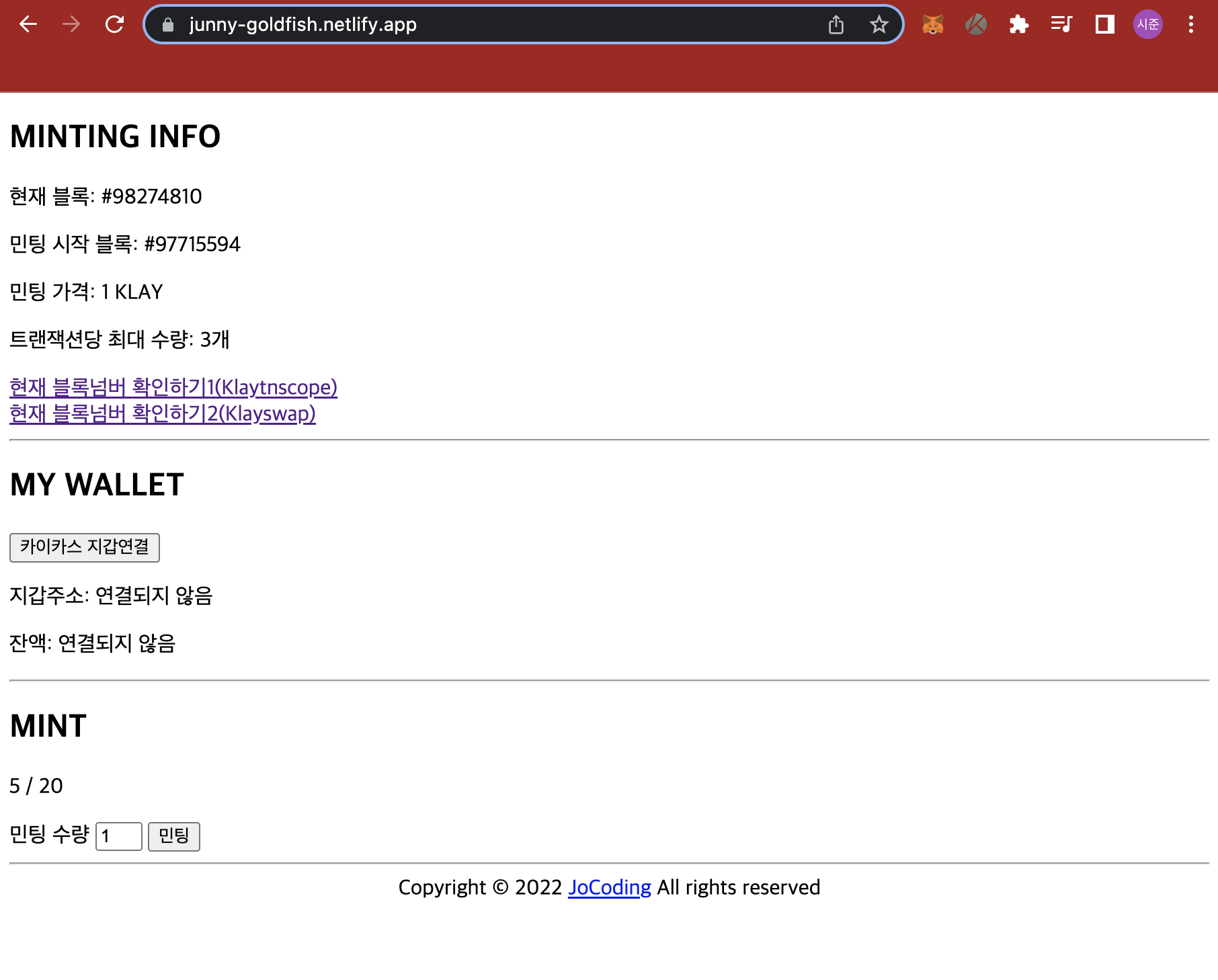 배포 이후 사이트에 접속하여 지갑으로 로그인 후, [카이카스지갑연결] -> [민팅] 버튼을 클릭하면 NFT를 민팅할 수 있다.