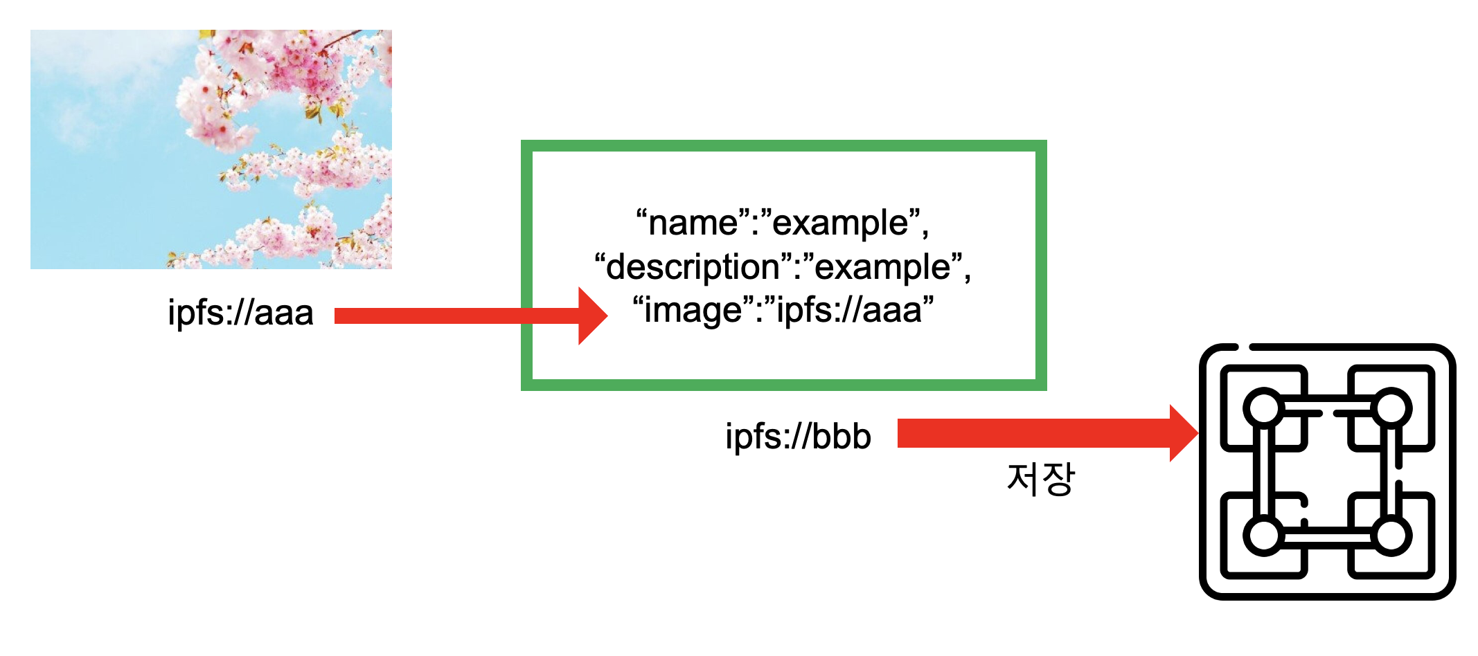 이렇게 저장된 이미지와 json 파일은 블록체인에서 접근할 때 저장된 CID 앞에 ipfs://를 붙여 접근한다.(ipfs://AAA)