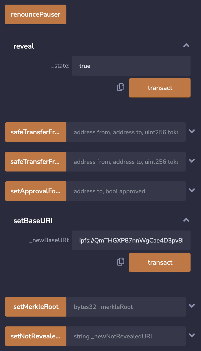 - setNotRevealedURI : reveal 행사 전 보여줄 이미지의 정보가 담긴 ipfs uri를 지정한다.