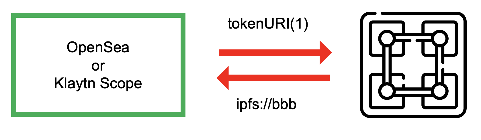 오픈씨와 같은 NFT 거래소에서 블록체인에 있는 블록을 가져올 때 token URI 함수를 이용해 블록의 정보를 가져오는데, 이 때 IPFS에 저장된 json 정보를 토대로 오픈씨(OpenSea) 또는 Klaytn Scope 등에서 NFT 정보를 가져와 보여준다.