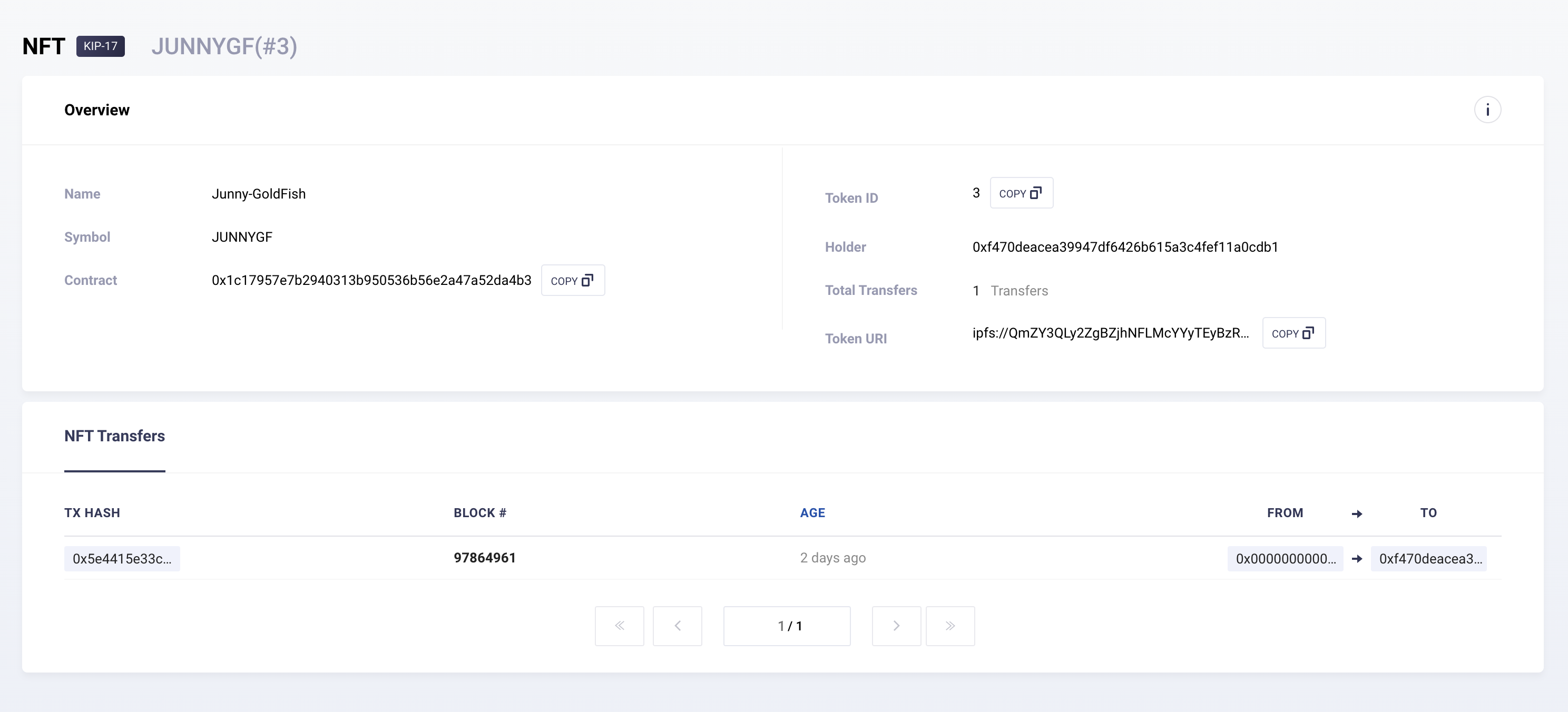 -> KIP17 기반 + 커스텀 코드로 작성 - Klaytn 블록체인에 Compile 및 Deploy 진행