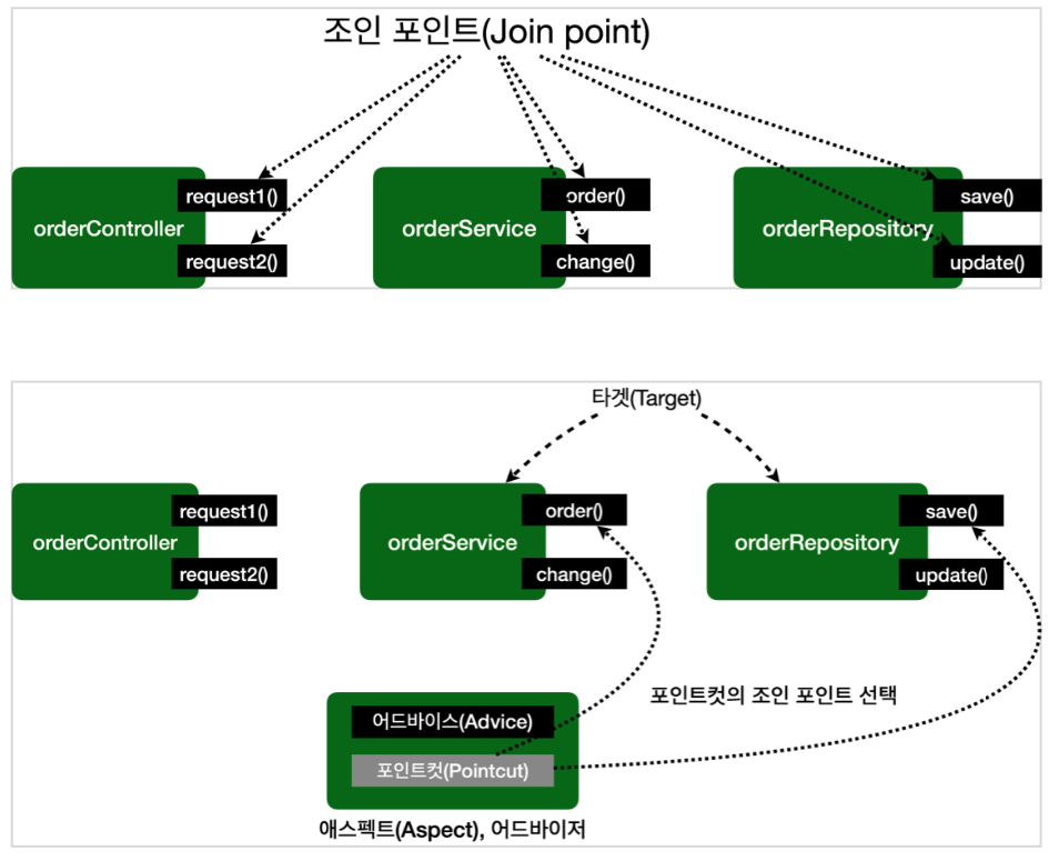 즉, 비즈니스 로직에 모든 것을 담으려하지 않고, 예외처리나 로깅 등은 공통 관심사로 뽑아내어 로직을 만들어 핵심 비즈니스 변경 시 영향도를 최대한 줄이고자 한다.
