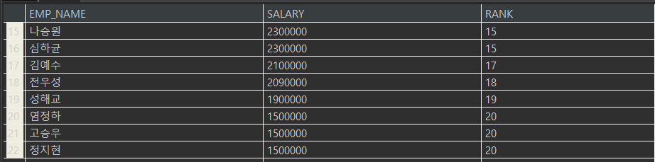 RANK는 동일한 값에 동일한 순위를 부여