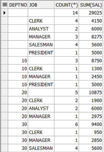 SELECT DEPTNO, JOB, COUNT(*), SUM(SAL)